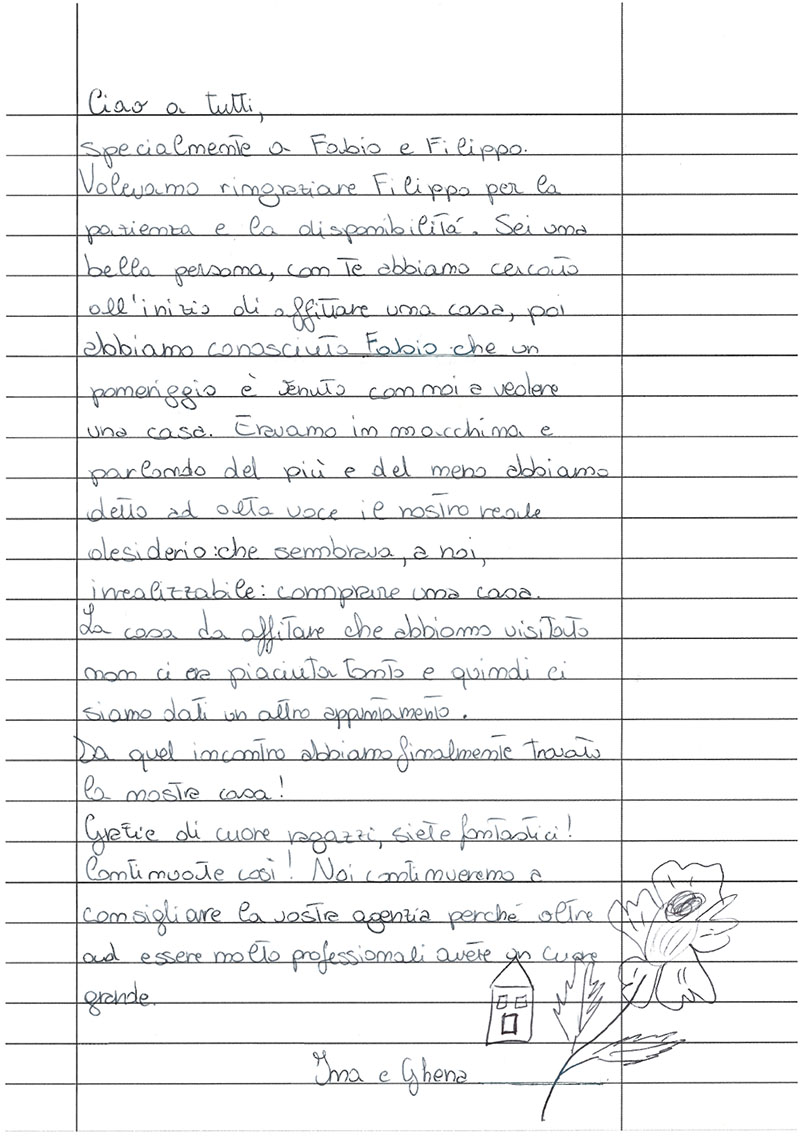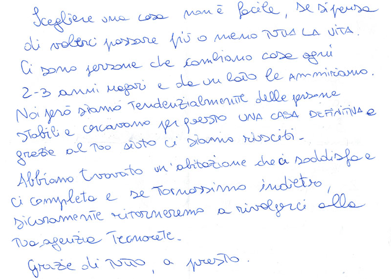 Scegliere una casa non è facile, se si pensa di volerci passare più o meno TUTTA LA VITA. Ci sono persone che cambiano casa ogni 2 – 3 anni magari, e, da un lato, le ammiriamo. Noi però siamo tendenzialmente delle persone stabili e cercavamo per questo UNA CASA DEFINITIVA e, grazie al tuo aiuto, ci siamo riusciti. Abbiamo trovato un’abitazione che ci soddisfa e ci completa e, se tornassimo indietro, sicuramente ritorneremmo a rivolgerci alla tua agenzia Tecnorete. Grazie di tutto, a presto.